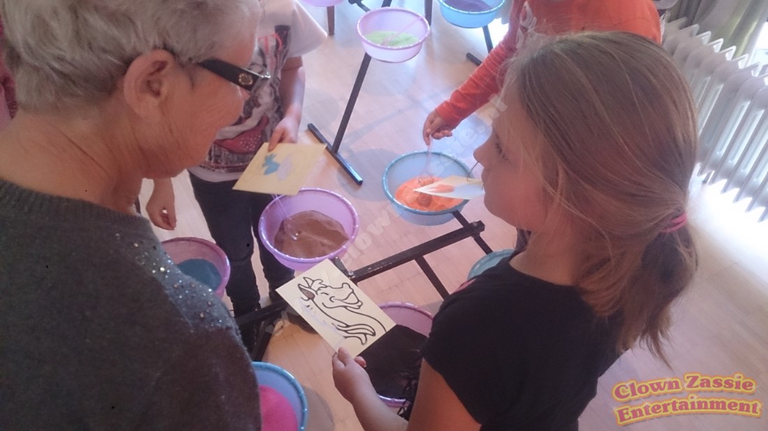 Spelen met zand.... Het is iets wat kinderen graag en lang blijven doen. Dit geld ook voor kleuren en tekenen. Bij Clown Zassie entertainment hebben we die twee samengevoegd: tekenen met gekleurd zand.